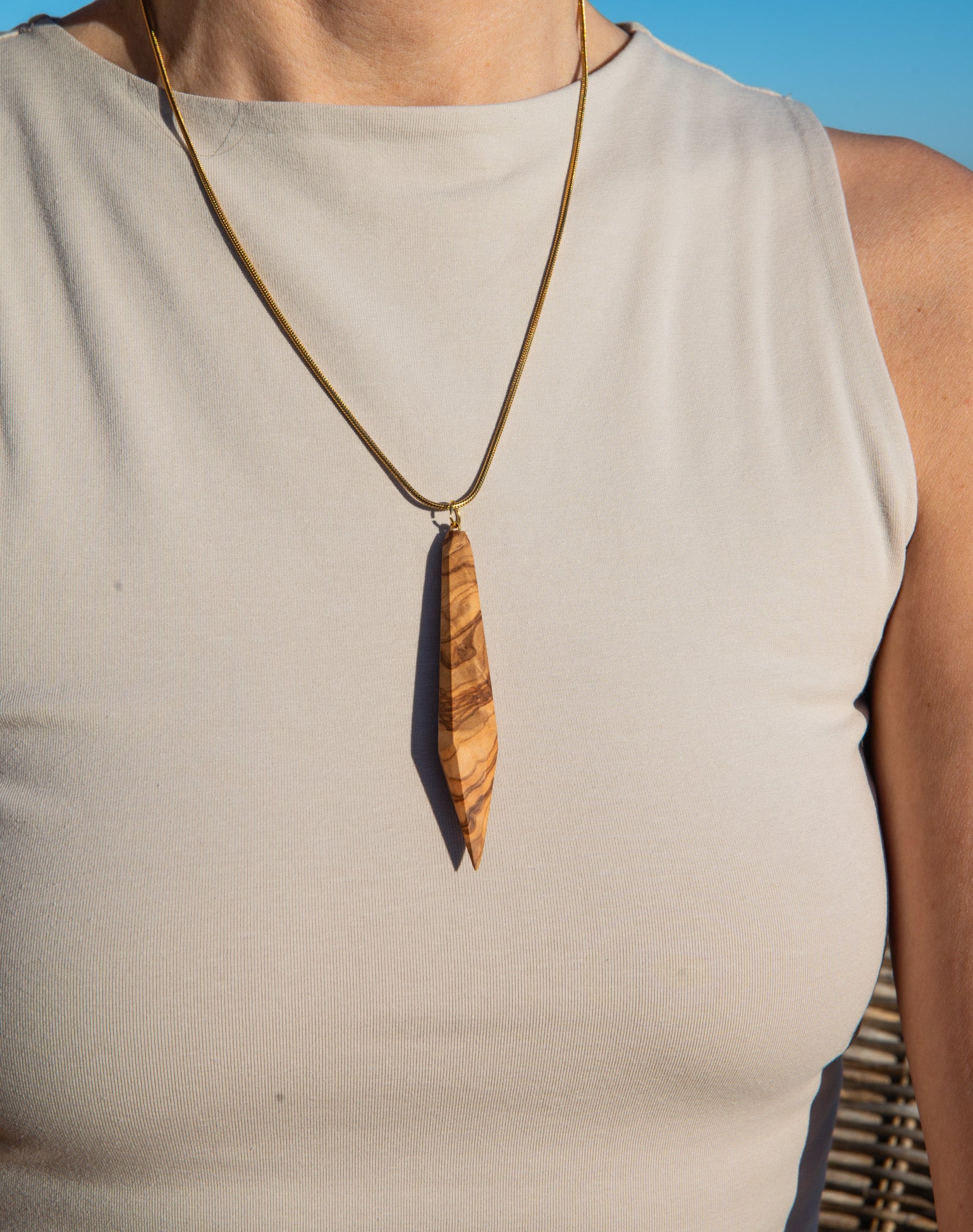Discover "Iris", our handcrafted olive wood pendant, featuring a stunning grain that whispers the age-old stories of the tree it came from. This unique piece, with its elegant long point, marries style with sustainability, as a portion of every purchase goes towards planting trees through our partnered NGO. Embrace this piece of nature's art and join us in nurturing the earth, one pendant at a time.
