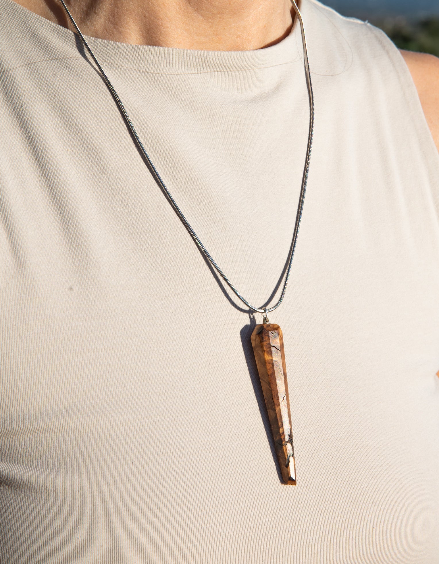 Discover "Sophia," a handcrafted olive wood pendant that captures the essence of wisdom with its intricate grain patterns, each line telling the story of the ancient tree from which it was born.